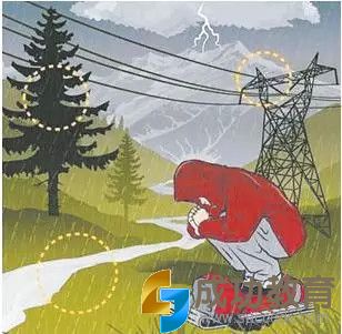 4.如果在户外看到高压线遭雷击断裂,因为高压线断点附近存在跨步电压,身处附近的人千万不要跑动,应双脚并拢跳离。