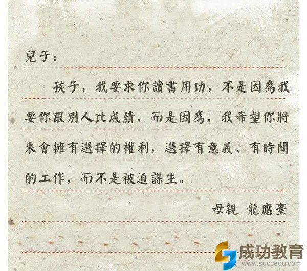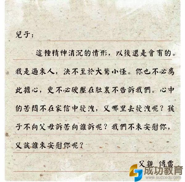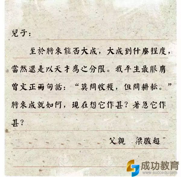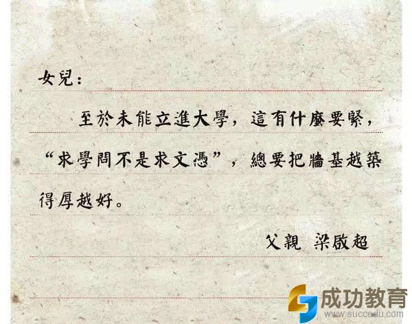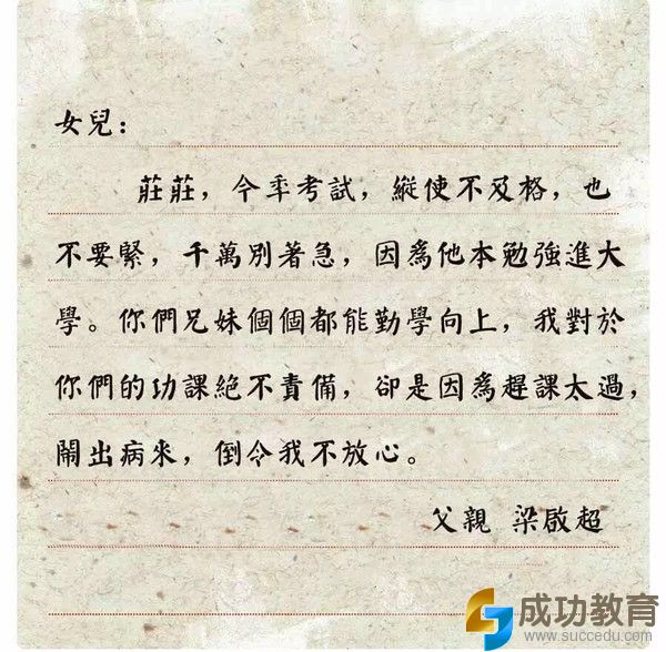 这封信是女儿梁思庄考大学时没考好,梁启超及时安慰的话。梁启超反对"填鸭式"的教育,他在书信中说得最多的是安慰、劝解的话,很少给孩子们提出什么具体的学习目标。