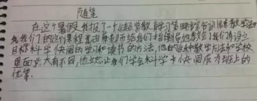 这段文字所记叙的内容就是我们约一个半小时的聊天内容,他在讲述时滔滔不绝,事无巨细,脸上写满了得意与兴奋。但贴上了作文标签,却只转化为了这不到70字的内容。我告诉他写的很棒,能完整的写出这么长的训练班的名字,还有文中的蔡老师也非常酷,我也很想去跟他一起学习。孩子表情告诉我他完全没有想到我对这短短70个字会有这样的回应,惊讶之余脸上更是写满了喜悦。我趁势让他每周都写一则他身边的故事,内容不限,字数不限,我也不会将这些内容告诉他的妈妈。他听闻作文课不用写作文,只要写这样的没有限制的随笔,高兴的答应了。两个月过后,他的随笔内容是这样的: