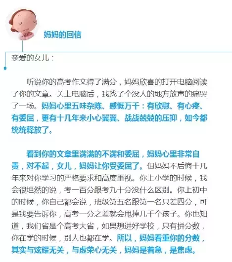 我被深深地击中了,不只是感动,有种泪往上涌的感觉:“你知道,妈妈每天都在计算你一天能睡几个小时,每天都在担心你的近视度数千万别再增加。每天晚上看你埋头苦读、奋笔疾书时,妈妈除了心疼还是心疼。”,“妈妈一直觉得愧对于你。如果妈妈是个有钱人,你就不需为将来的生计而努力学习。妈妈一定会尽我所能,让你避开高考,去国外接受更宽松更自由的教育。如果妈妈手中掌权,依靠广泛的人脉,你的学习和就业之路也会轻松不少。可是,妈妈只是芸芸众生中最普通的一员,妈妈能为你做的只有严格的监督还有不停的鞭策,你自己的前程还要靠你自己争取。妈妈除了愧疚还是愧疚。”,“孩子,也许在妈妈的严格管教下,你不得不舍弃了一些你的自由、你的爱好,你不得不在我们的鞭策下不停的奔跑。但是,请不要质疑爸爸妈妈对你的爱,用邢台胡子宏老师的一句话作为妈妈的心声吧:亲爱的孩子,爸爸妈妈愿意把身体的每一块骨骼,都变成你成长的阶梯,任由你攀爬着前进……”。