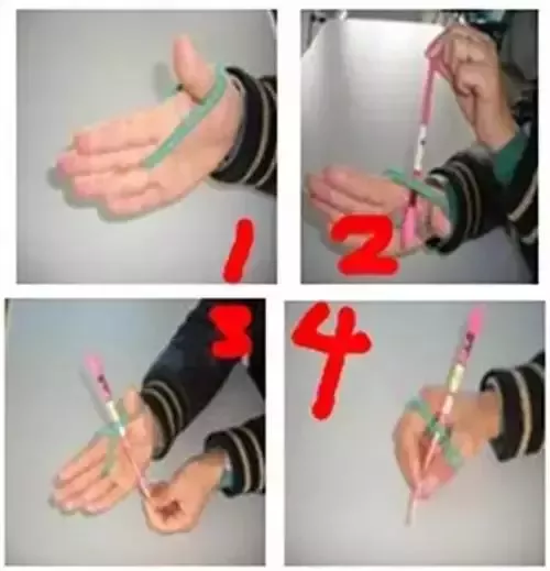 方法二:首先将皮筋套入拇指、食指和中指根部,再将笔杆顶端从虎口上部皮筋下插入,伸出后正好压住下根皮筋,最后将笔尖向下压180度,上部笔的顶端正好挑起下根皮筋,OK了!是不是很简单?