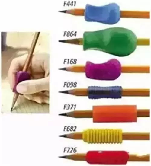 握笔器的使用原理是有一个凹槽能指引孩子要把手指放在那里面,所以如果你的孩子写字时手指距离笔尖总是很近可以考虑买一个握笔器啦!