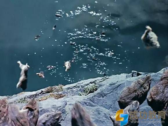 一个六分钟长的影片,孩子们睁大眼睛看着成千上万的老鼠在慌张地推挤奔窜,窜过森林,窜过溪流,窜过田野,仿佛在没命地逃亡;最后奔到了悬崖边缘,下面就是大海,最前面第一批老鼠毫不迟疑地就往下跳,后面跟上来的,不明究理,一批一批跟着跳。老鼠载浮载沉地在汹涌的海浪里漂,最后集体淹死。