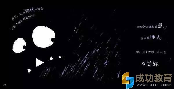 而且这个糟糕的旅途持续了很长很长时间周围变得越来越黑,越来越吓人。嗯,这个世界一点儿也不美好,小怪兽觉得自己的力气都用完了,他想放弃寻找,他想回家了。