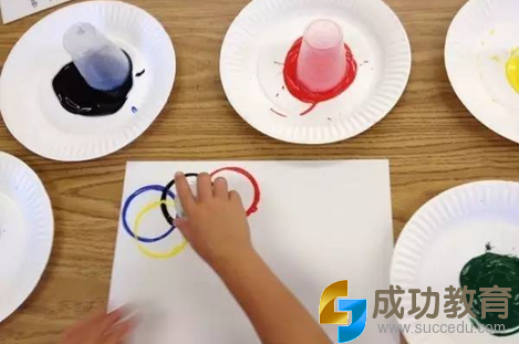 tip 1:一次性杯子倒扣在颜料上,在纸上一按,就可以轻松制作奥运五环!是不是很有趣呢?