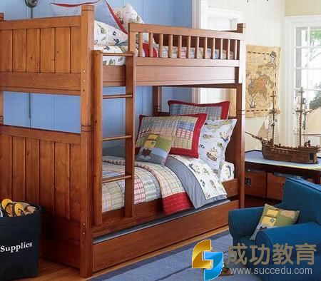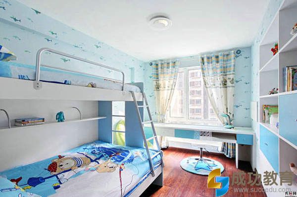 ②双胞胎的房间也可以选择L型的上下床,衣柜放在床下面,可以节省空间。