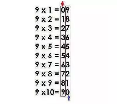 九九乘法表的背诵很吃力?其实只要在十位数上从0写到9,个位数上从9到数回0,马上写出完整的表格。考试更轻松!