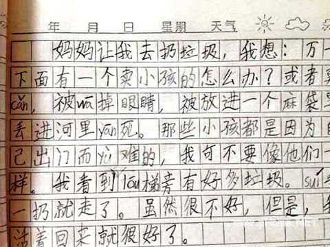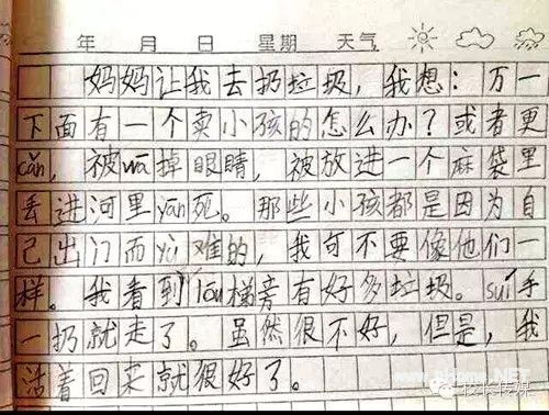 妈妈让我去扔垃圾,我想:万一下面有一个卖小孩的怎么办?或者更can(惨),被wa(挖)掉眼睛,被放进一个麻袋丢进河里yan(淹)死。那些小孩都是自己出门而yu(遇)难的,我可不要像他们一样,我看到lou(楼)梯旁有好多垃圾,sui(随)手一扔就走了。虽然很不好,但是,我活着回来就很好了。