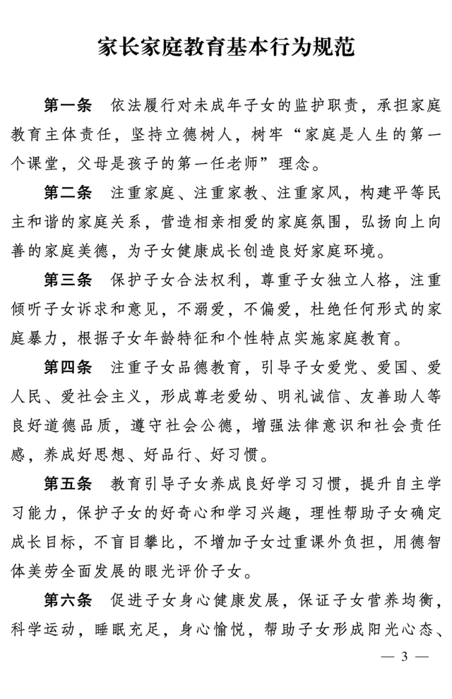 第三条 保护子女合法权利,尊重子女独立人格,注重倾听子女诉求和意见,不溺爱,不偏爱,杜绝任何形式的家庭暴力,根据子女年龄特征和个性特点实施家庭教育。