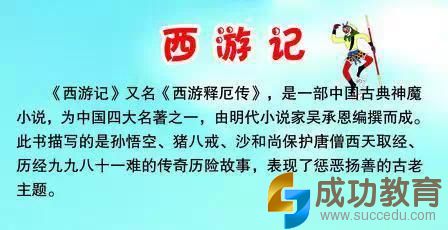 3、西天取经的故事表现了神魔小说的两大主题:(寻找与追求),(斩妖与降魔)。它告诉人们:(为了寻找、追求、实现一个美好的理想和目标,为了完成一项伟大的事业),必然会遇上或多或少的、或大或小的、各种各样的困难和挫折,必须去(顽强地战胜这些困难,克服这些挫折)。