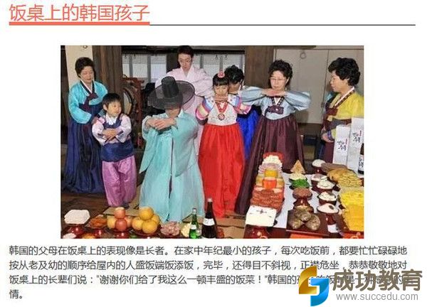 韩国的家庭在饭桌上是在通过氛围来教化孩子,让孩子不知觉中懂得感恩;美国的家庭在饭桌也是通过习惯来教化孩子,让孩子不知不觉中学会独立和承担责任。