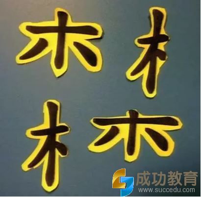 接着,我会给小孩展示四个形态各异的“木”字部件(见下图),这四个部件都是从四个一样大小的字上剪下来的,这一点我一定会和孩子们强调清楚。然后,我便请学生把这四个部件归类,通常学生们会将其分成两组。分法不同也没有关系,只要他能说出理由就好。当你问他为什么这样分时,他就会解释说,这两个比较瘦,这两个比较矮。这个过程就是异中求同。