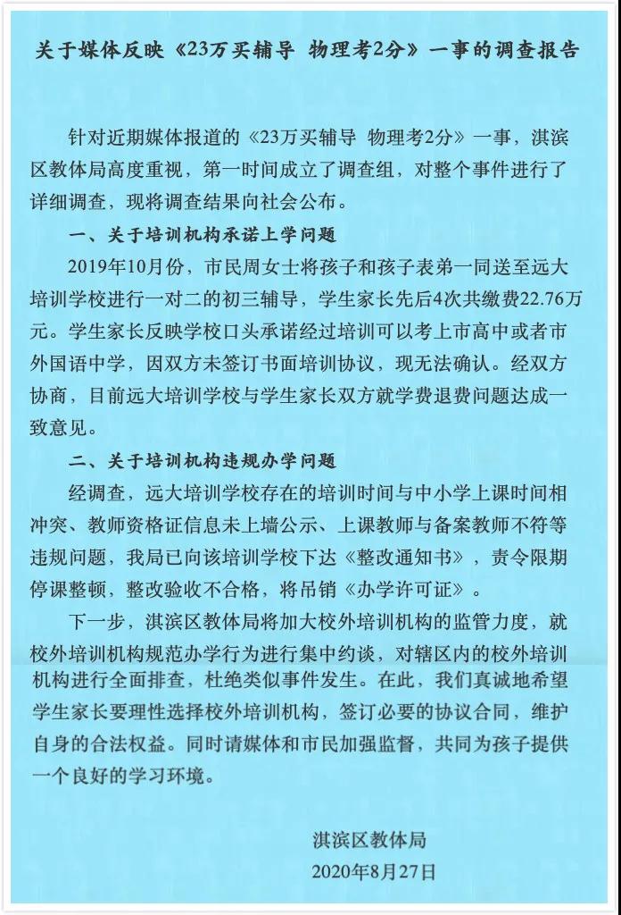 ●☛█▼▲成功教育HtTp://Www.succedu.COm◐◐◐◐●☛█▼▲◐◐◐◐●☛█▼▲8月27日,据“鹤壁市淇滨区教体局”官方微信消息,针对近期媒体报道的《23万买辅导 物理考2分》一事,鹤壁市淇滨区教体局高度重视,第一时间成立了调查组,对整个事件进行了详细调查,并将调查结果向社会公布。