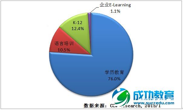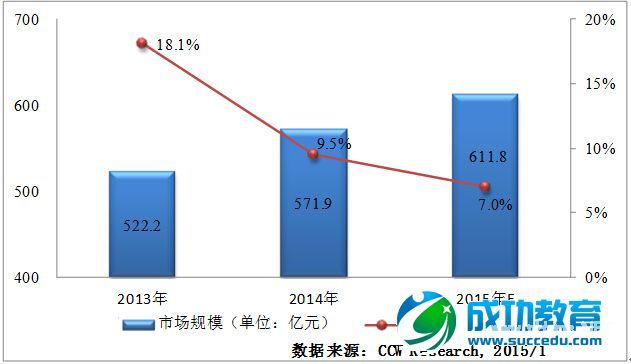 计世资讯的调研数据表明,2014年中国在线教育市场规模达到824.9亿元人民币,预计2015年将达到965.2亿元人民币。其中,高等学历教育市场学生数量和需求相对稳定,未来市场份额波动较小;K-12未来增长速度明显;语言培训占比位居第三位;企业E-learning占比最小。