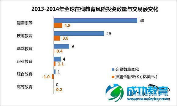 与2013年相比,本年度教育配套服务和技能教育在投资数量、投资金额方面的增长都非常明显;基础教育、职业教育领域小幅增长;综合教育、高等教育领域的投资增长相对缓慢。