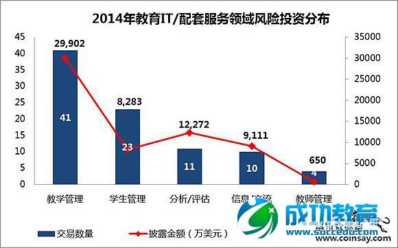 2014年获投资的IT/配套服务企业以教学管理业务为主,包括在线教育平台搭建、教学设备等教育资源管理等,投资事件41起,交易额达到3亿美元;针对学生的学习管理与服务平台投资事件23起,交易额达到8283万美元;而学生教育数据与信息,以及学习效果评估领域的投资事件11起,交易额达到1.2亿美元;学生、家长、教师的信息交流平台以及教师管理平台也都吸引了一定的风险资本进入。