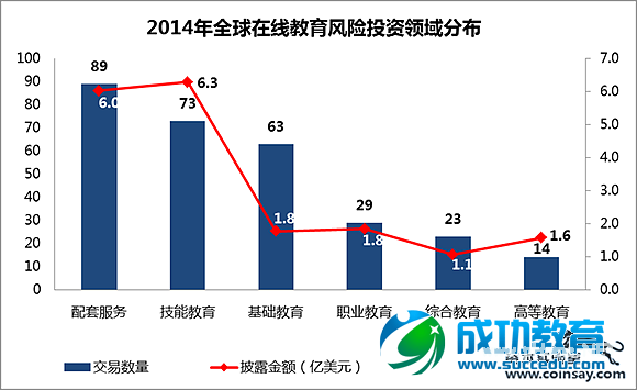 2014年全球在线教育行业投资事件中,IT/配套服务领域投资事件89起,占比30.6%,交易额6亿美元,占比32.4%;技能教育投资事件73起,交易额6.3亿美元;基础教育投资事件63起,交易额1.8亿美元。