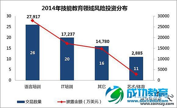 语言培训领域的投资主要集中在中国市场,投资事件16起,交易额2.4亿美元,以少儿和成人的英语培训为主;IT培训和艺术/体育培训以美国和中国市场为代表。在IT培训领域,美国和中国市场投资事件各9起;在艺术/体育培训领域,中国6起,美国3起。