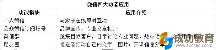 第1步,明确微信营销定位点 微信推广的是教师个人还是教学点的教师团队?从企业品牌宣传的角度来看,推广教学点的教师团队肯定优于教师个人,小荷认为:(1)教师个人不可控因素太多,比如名师生病、外出学习等都会影响到这个阶段的招生;(2)用大量的资源推广某个名师会出现名师班爆满而其他老师班门可罗雀,表面上看是对老师的间隔区分,但其浪费的营销资源却很大。(3)粉丝经济中的粉丝应是品牌的粉丝,而不是个人的粉丝,这样才能保证机构品牌在当地的延续性,避免因教师流动造成品牌流失问题。 第2步,梳理微信功能 微信虽然讲究小而美,可其功能列表越来越长,现在微信有20多个功能,再加上开发接口,使其功能更多。为了减少微信营销的技术、培训成本,我们只要将其官方功能综合利用,也能实现预期的营销效果。根据小荷的尝试,微信的“个人微信号”、“公众微信订阅号”、“微信群”、“朋友圈”四大功能,既简单易上手,也是家长关注度较高的模块。将功能进行梳理后,小荷对其进行如下简单分工,让营销变得简单。