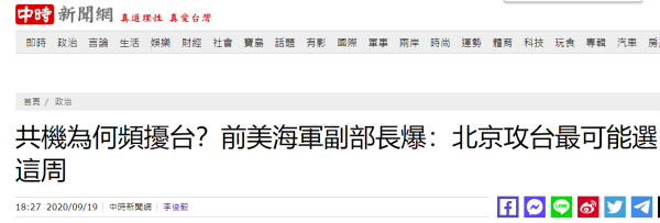 对于近期台海情势,台湾“中时新闻网”援引《中评社》的报道称,曾任美国海军部副部长,立场亲台的克罗普希17日在美《国会山报》撰文做出研判。他称,美国大选对台湾可能是一种“危险信号”,对大陆则可能是一个机会。解放军最近一系列演习不仅仅是政治信号,也是为对台发动攻击做军事准备,目的是在美国及其盟友做出回应之前“征服台湾”。
