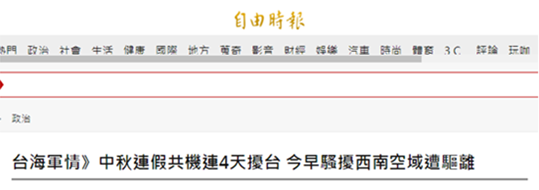 《自由时报》说,中秋(国庆)假期期间,台湾周边空海域相当热闹,除了解放军军机、美国军机,还有解放军军舰2日疑出现在花莲外海,3日又有加拿大军舰由南往北穿越台湾海峡。