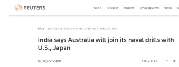 印度国防部在一份声明中说:“随着印度寻求在海上安全领域加强与其他国家的合作,并鉴于与澳大利亚的国防合作不断加强,马拉巴尔2020军演将有澳大利亚海军的参与。”