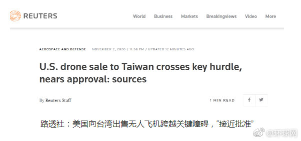 就在美国大选登场前一日,媒体披露美国计划向台湾出售四架先进美制无人飞机,若美国务院正式通知国会,这将是半个月内美国第三次对台军售。专家3日对《环球时报》表示,今年美国选情复杂,这不排除是特朗普通过让军火商获取利益的方式来进行拉票。
