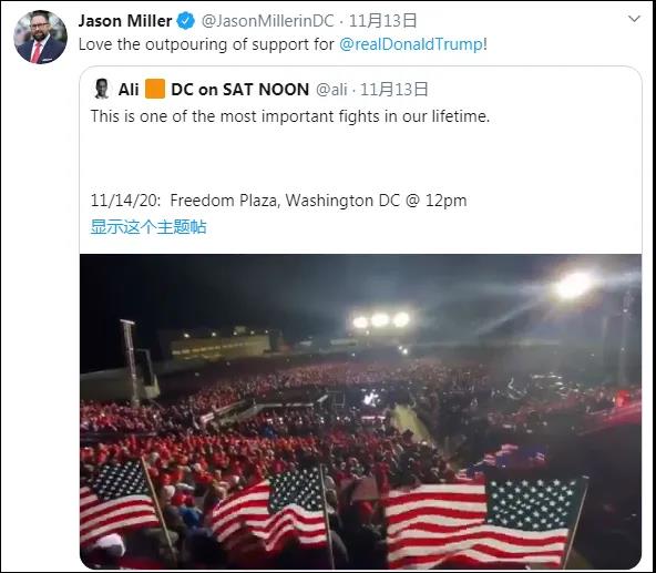 12日,特朗普的竞选顾问杰森·米勒(Jason Miller)开心地转发了一条支持集会的推文,并称“超爱大家对特朗普源源不断的支持!”
