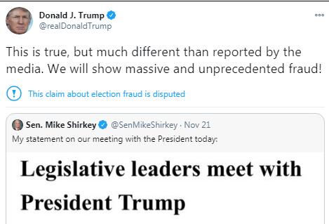 但特朗普还不肯放弃。他周六在推特上一边援引希尔基的声明,一边替自己“找补”称,(关于会议的)事实与媒体报道“很不一样”,“我们会展示大规模、前所未有的选举欺诈!”