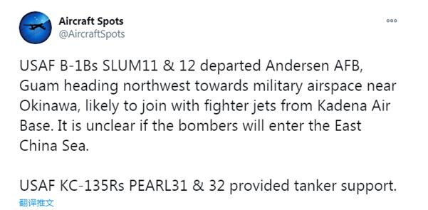 专门记录军事飞行器动态的推特账号“飞机守望”12月16日发布消息称,当天两架美国空军的B-1B轰炸机从关岛安德森空军基地起飞,朝着西北方向飞往冲绳附近的空域。“飞机守望”推测,这两架B-1B轰炸机可能会与从嘉手纳空军基地起飞的战斗机汇合,目前还不清楚这些轰炸机是否会进入东海。