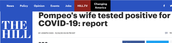 美国《国会山报》25日援引据彭博社的消息报道,知情人士称,美国国务卿蓬佩奥的妻子苏珊·蓬佩奥本月早些时候新冠病毒检测呈阳性,使其与丈夫蓬佩奥被隔离。