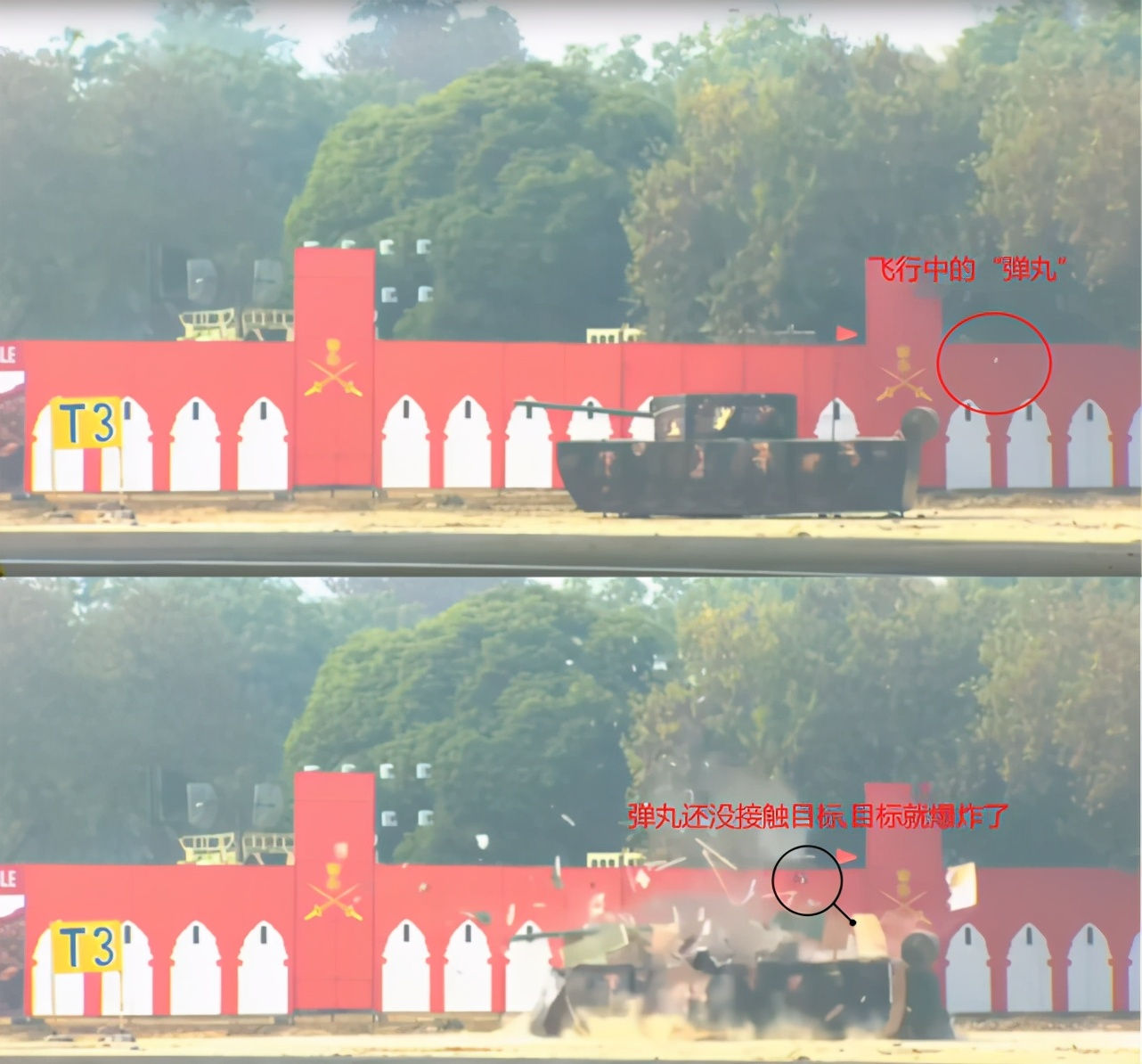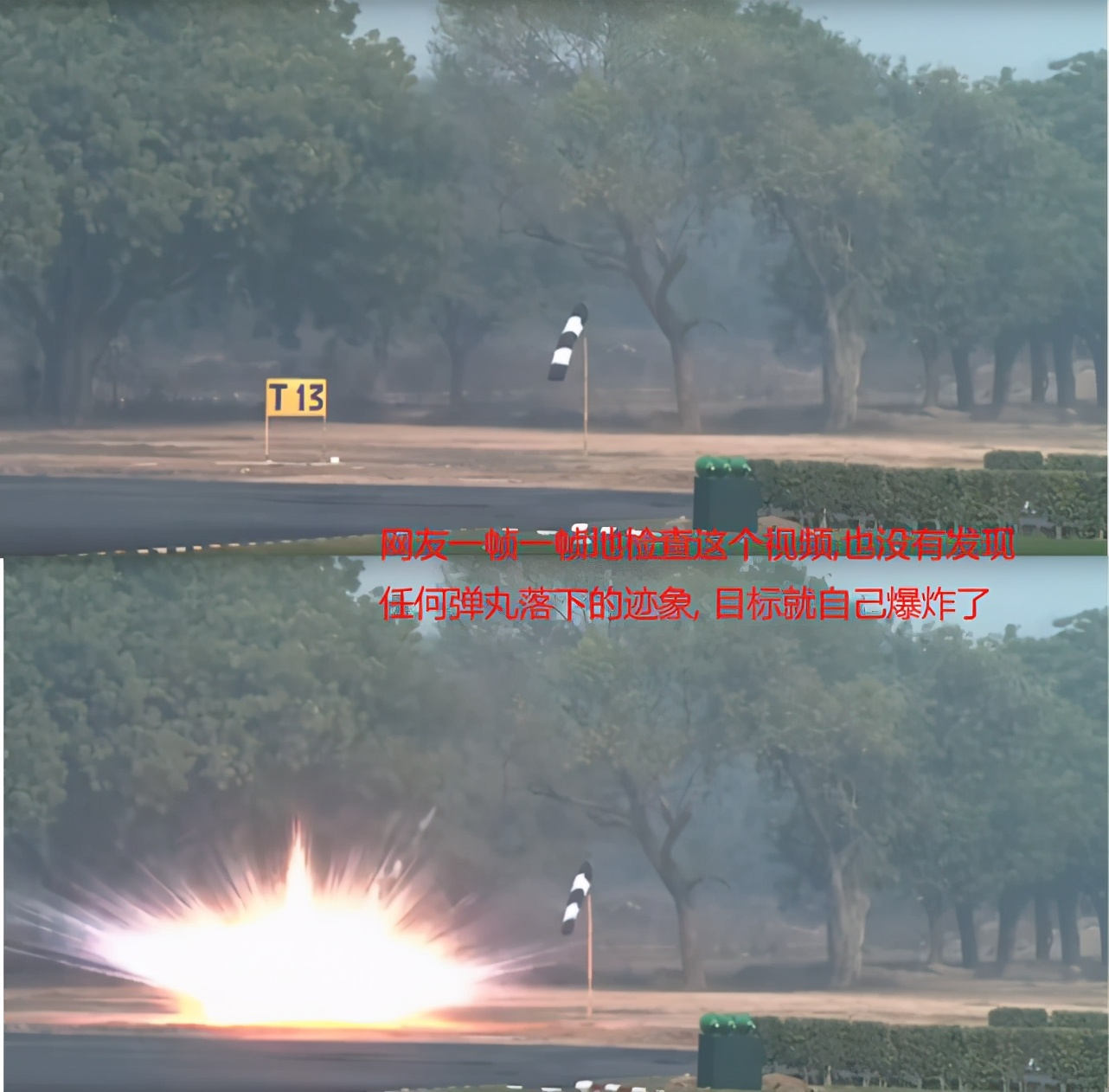 可惜,打脸来得太快。印度媒体将这次演示的视频发到了互联网上,引起了许多网友的好奇,将视频逐帧播放,很快发现了漏洞。印度陆军展示的无人机“攻击目标”的行动,根本就是假的。在两个场景中,无人机发射的“弹丸”还未接触到目标,目标就已经爆炸了。在另一个场景中,网友们逐帧检查了目标爆炸前的高清画面,完全找不到有任何“弹丸”落下的迹象。很明显,这几个场景中的目标是遥控爆炸的,根本和无人机无关。