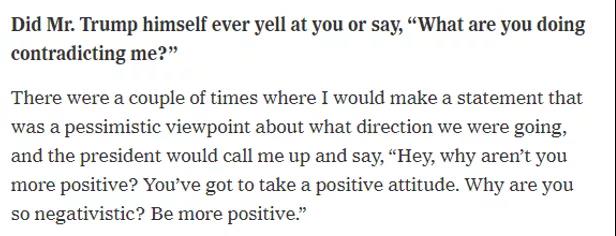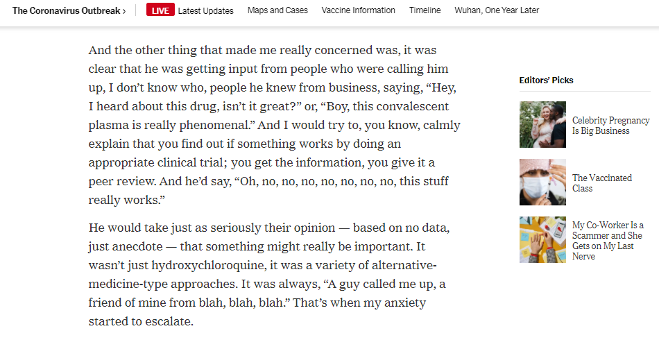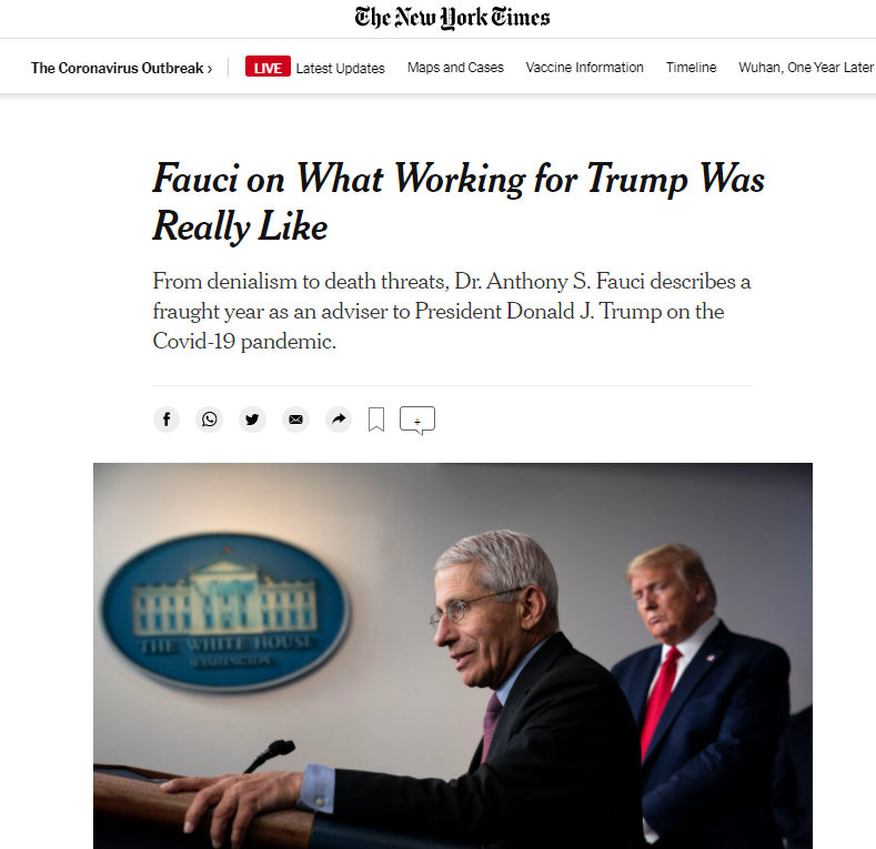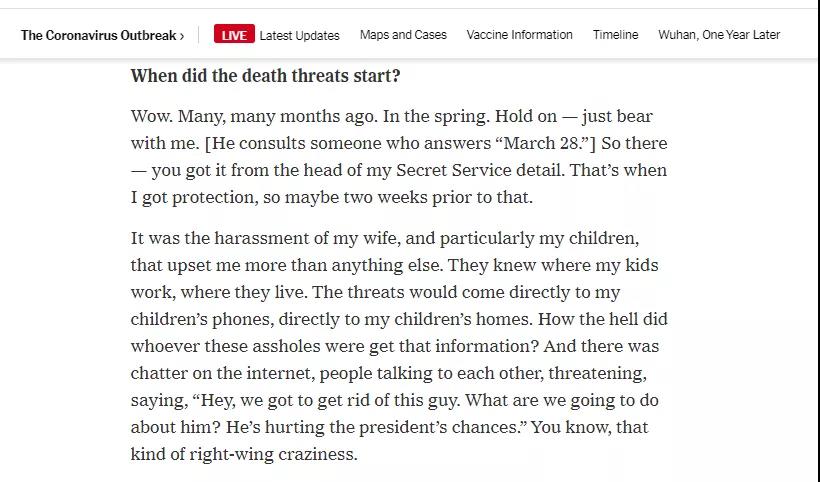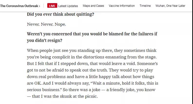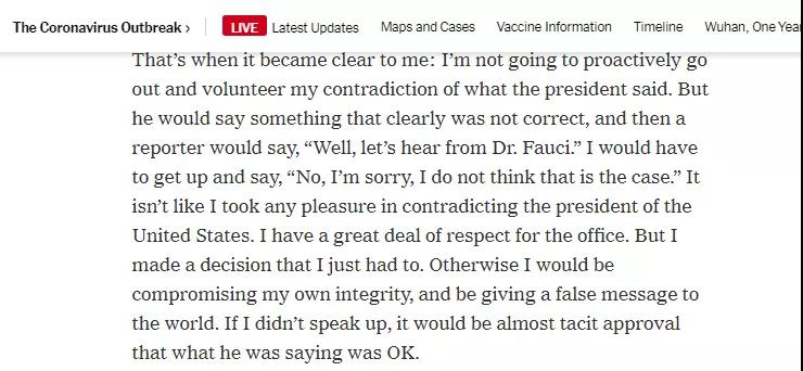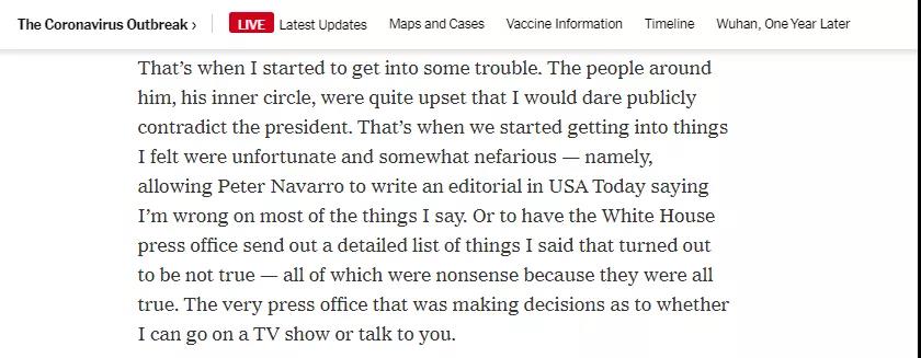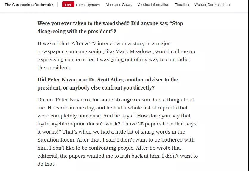 在中国,许多玩微信的年轻人大多可能经历过这么一件事,那就是在你家长辈云集的“家人群”里,一些长辈经常会将一些谣言、假新闻或者伪科学之类的东西转发进来,再经过其他长辈的转发而进一步扩散到了你的朋友圈里。 而当你希望纠正他们时,则往往会遭到白眼,认为你不尊重长辈,并指责你说的才是错误的。 但让人难以置信的是,这在微信里经常上演的一幕,却真实地发生在了去年美国的白宫里。 耿直哥之所以这么说,是因为曾经给美国前总统特朗普在去年一年里操持防疫工作的美国传染病学专家福奇,近日在接受美国《纽约时报》采访时,不仅讲述了他在过去一年里在白宫经历的风风雨雨,还回答了该报对于他和特朗普关系如何的提问。 (图为福奇在《纽约时报》的访谈中讲述他过去一年在特朗普当局的经历) 比如,如下图所示,在回答《纽约时报》提出的“你是在什么时候发现和特朗普的关系出现了问题”的提问时,福奇就着重描述了这一让他特别担忧的情况: 福奇还特别提到了特朗普的忠实“舔狗”、白宫前贸易顾问皮特·纳瓦罗,称出于某些“奇怪”的原因,纳瓦罗一直对福奇有着某种“执念”,甚至于他曾经找来25篇内容完全都是胡扯的文章,还打印了出来,然后拿着这些文章质问福奇为什么要说羟氯喹对新冠病毒无效。 (图为福奇在《纽约时报》的访谈中讲述他过去一年在特朗普当局的经历) 但特朗普本人却并没有对福奇总是和他唱反调而大发雷霆,而是像“家长群”里那些最“德高望重”的长辈一样,用一种居高临下的无奈地口吻对福奇说到:你为啥总是这么消极,为什么你就不能积极点? (图为福奇在《纽约时报》的访谈中讲述他过去一年在特朗普当局的经历) 这些白宫“家人群”里的一幕幕,也逐渐让福奇明白了一件事。如下图所示,他对《纽约时报》表示,后来他就不会主动再在这个“群”里顶撞特朗普了。但如果有公众询问他关于疫情的问题,或是特朗普主动问他的观点,他还是会如实说出自己的观点。 不过,即便工作的环境如此之恶劣,福奇对《纽约时报》表示他从来没有想过辞职或离开。因为他担心一旦他离开,一方面可能就“不会再有人敢说真话”了,另一方面特朗普及其身边的人就会更加随意地淡化疫情了。而只要他在,他就至少能让这些人不太放肆。 (图为福奇在《纽约时报》的访谈中讲述他过去一年在特朗普当局的经历) 因此,哪怕他从去年3月时就开始遭到过死亡威胁,甚至被人用后来查明是无害的不明白色粉末袭击过,哪怕妻子认为他或许可以考虑离开,福奇最终还是义无反顾地选择了留下。 (图为福奇在《纽约时报》的访谈中讲述他过去一年在特朗普当局的经历) 然而,值得注意的是,在面对《纽约时报》提出的“你是否认为特朗普害死了美国数十万人”这个问题时,福奇并没有像很多人以为地那样给出肯定的答案,而是选择拒绝介入这样的探讨。 “我无法评论此事”,他说,“人们总喜欢问这个问题,做出这种谴责性极强的直接关联,但我不想介入其中,抱歉。”