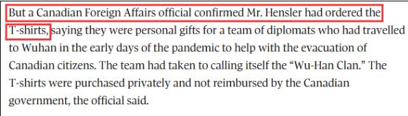 从《环球邮报》的报道中可察觉到,加拿大外交部发言人和透露消息的匿名外交官员在回应此事时,也似乎有意为加政府撇清关系。有匿名官员称,这些文化衫属于个人采购行为,费用并不由加政府报销。