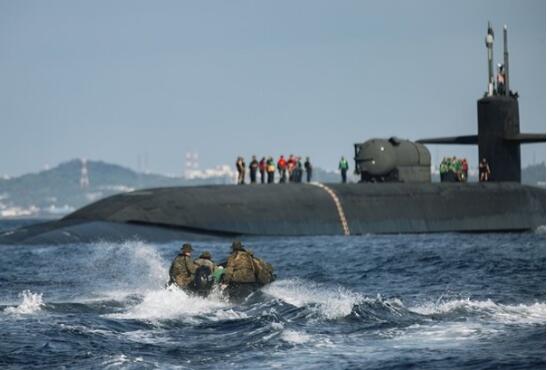 俄亥俄号战略核潜艇与海军陆战队进行联合演练。