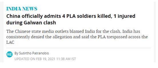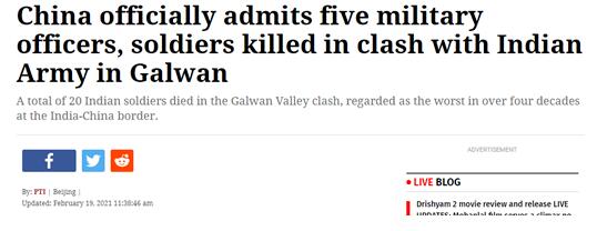 此消息迅速在印度引燃激烈反馈,不少印度主流媒体已进行重点报道。而这些印媒将报道重点,一是放在解放军首次承认在加勒万河谷冲突中有重大伤亡方面,另一方面或暗示、或明确质疑解放军隐瞒实际伤亡数字。