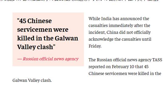 《印度经济时报》更是引用俄罗斯塔斯社在2月10日的相关报道称,共有45名解放军在冲突中牺牲。