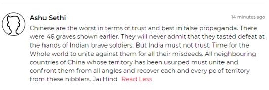 ——“中国人毫无信誉可言,且善于虚假宣传。早些时候有46座墓地被发现。他们永远不会承认在勇敢的印度士兵手中尝到了失败的滋味。但是印度决不能相信。是时候让全世界团结起来反对他们的所有恶行了。与中国有接壤的邻国必须团结起来,从各方面对付中国,从这个小偷手中夺回每一寸领土。”