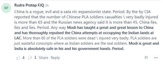 无论怎样,莫迪狠狠的给中国人上了一课,彻底击退了中国要抢占印度LAC(实际控制线)附近领土的企图。解放军遭受了超过60人的重大伤亡,这是在拿己方士兵当炮灰,而印度士兵才是真正的士兵。莫迪是伟大的,印度在他和他的政府手中是绝对安全的。”再看看《印度快报》文章《China officiallyadmits five military officers, soldiers killed in clash with Indian Army inGalwan》评论区的普遍言论: