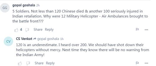 此外,看看《印度经济时报》文章《China officiallyadmits five military officers, soldiers killed in Galwan clash with Indian Army》评论区的代表性言论: