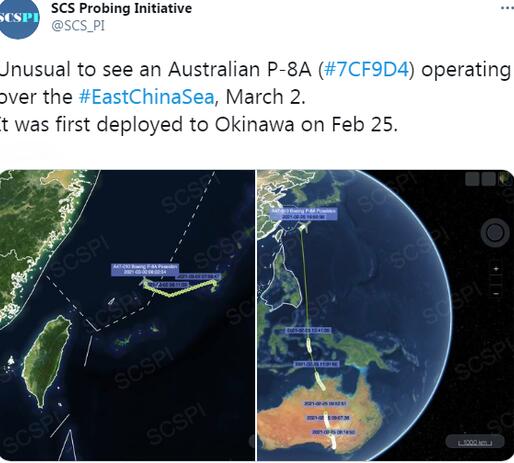 据“南海战略态势感知”计划平台3月2日报道,当日上午,澳大利亚空军1架P-8A反潜巡逻机(7CF9D4)进入东海空域活动。这是该机自2月25日从澳大利亚部署至冲绳嘉手纳基地以来的首次行动,其目的有待进一步观察。