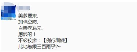 对于台军14日在松山机场附近部署“爱国者”导弹车组,岛内有网友讽刺民进党当局:“美爹要来,加强空防,百善孝为先,应该的!不必狡辩:例行训练,此地无银三百两乎?”↓