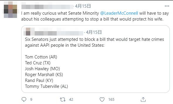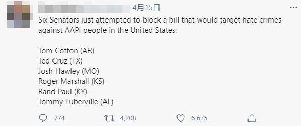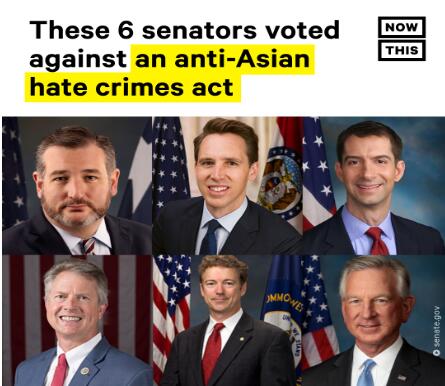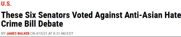 6名美参议员投票反对审议"反亚裔仇恨犯罪法案"