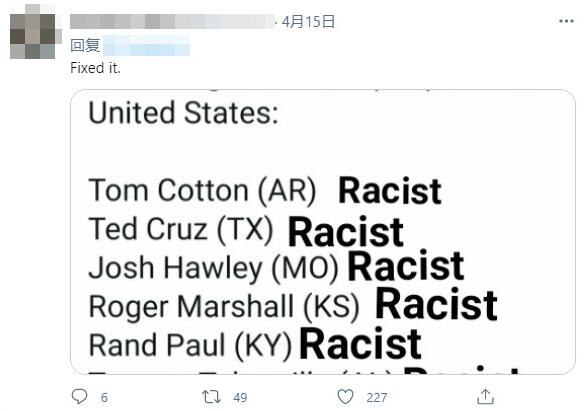 在推特上,当有人列出投下反对票的参议员姓名后,有网民就跟评回复了一张图片,图片上直接将他们标注为了“种族主义者”(Racist)。