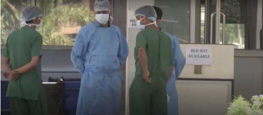 印度一医院内的医护人员在交谈,门口写着“病床已满”视频截图
