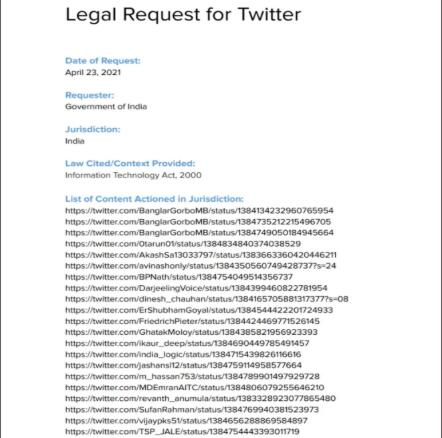 该发言人补充称,推特已经将处理结果和相关情况通知到了推文发布者。根据推特官方在Lumen数据库上披露的信息显示,印度政府要求删除的推文多达50多条。一些推文来自该国议员和公众人物,印度西孟加拉邦劳工和法律内阁部长加塔克(Moloy Ghatak)就是其中之一。