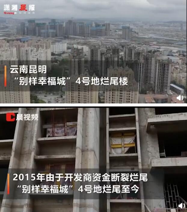 由于开发商资金链断裂,昆明“别样幸福城”小区4号地从2015年起烂尾至今。近日,陆续有50多户业主,因经济压力搬进烂尾楼。烂尾楼里没水没电没气,住户用雨水洗脸,晚上依靠太阳能灯照明。住户陈艳春是一名单亲妈妈,带着6岁女儿住进到处是坑洞的烂尾楼毛坯房。烂尾楼居民建立公共食堂,修建了小路和阶梯,还自发组织了巡逻队。8月2日,街道办在和业主的协商中承诺,将在近期复工,但未给出明确日期。