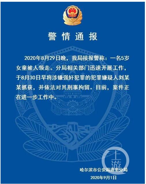 9月1日,哈尔滨市公安局道里分局发布警情通报,2020年8月29日晚,该局接报警称:一名5岁女童被人领走。分局相关部门迅速开展工作,于8月30日早将涉嫌强奸犯罪的犯罪嫌疑人刘某某抓获,并依法对其刑事拘留。目前,案件正在进一步工作中。 家人发起众筹,网友接力伸出援手!