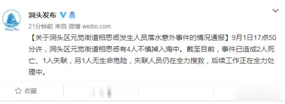 刚刚,“洞头发布”发布消息:9月1日17点50分许,洞头区元觉街道相思岙有4人不慎掉入海中。截至目前,事件已