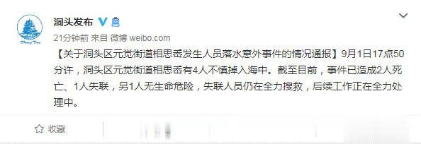 息:9月1日17点50分许,洞头区元觉街道相思岙有4人不慎掉入海中。截至目前,事件已造成2人死亡、1人失联,另1人无生命危险,失联人员仍在全力搜救,后续工作正在全力处理中。